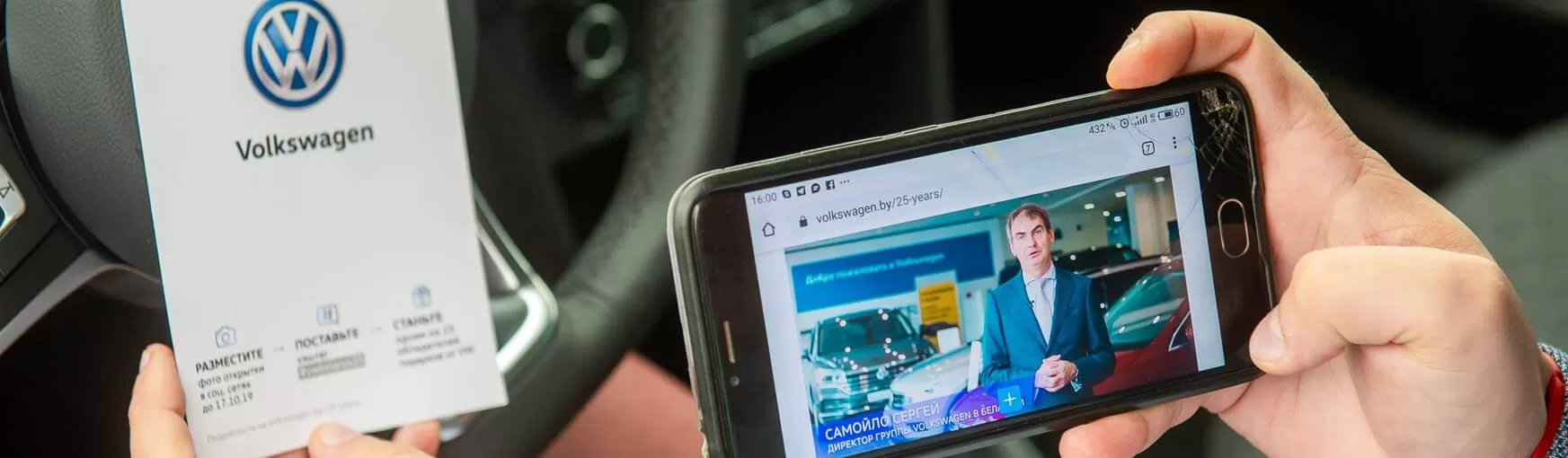 В ночь с воскресенья на понедельник сотрудники Volkswagen совместно с волонтерами доставили более 5 000 открыток владельцам автомобилей. На открытках, которые утром владельцы VW обнаружили на лобовом стекле своих машин, был размещен специальный QR-код. В видео, доступном по коду, директор группы Volkswagen в Беларуси Сергей Самойло лично поздравил автомобилистов: